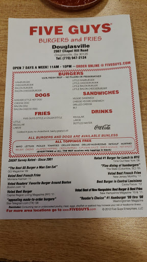 This is an excellent Five Guys location. Clean facilities, ample parking, and nice staff. The best burger you can get in Douglasville and for less that $9. Our family highly recommends this restaurant for lunch or dinner!