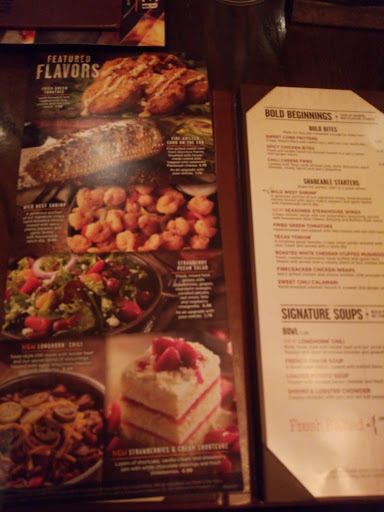 Only been open about an hour. Filthy bathrooms. Toilets dirty.floors dirty. Garbage overflowing. Obviously not cleaned the night before. That was the womans...My husband said the mens was really ruff. Oye server reported problem...Someone went in and walked out. If the bathroom is dirty you have to wonder about the kitchen. Our server was great. Husband wanted prime rib but they had none.. good thing we were just traveling thru. Would hate for this to be our longhorn...Mgr might need to be retrained in cleanliness.