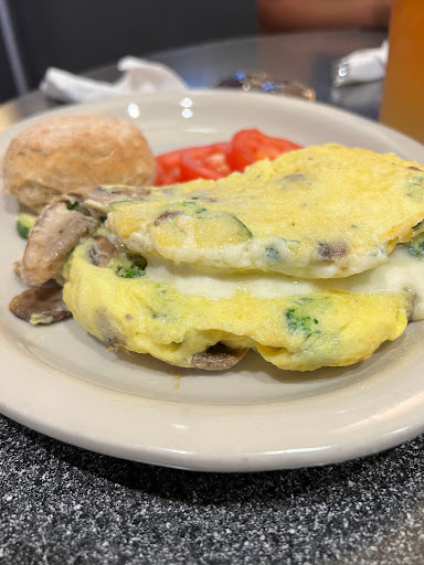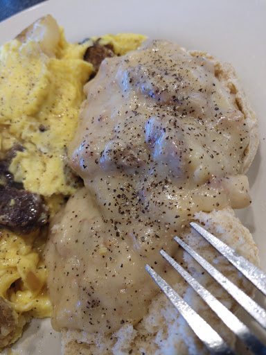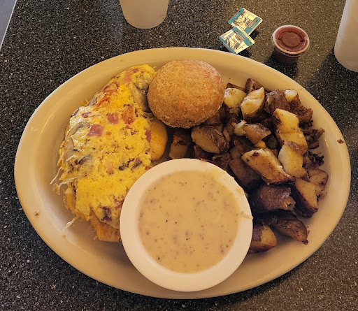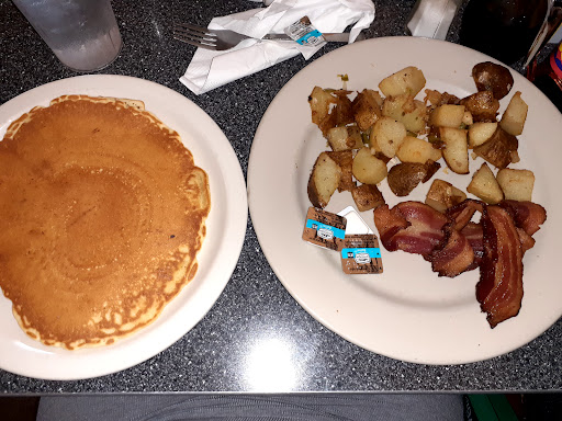 I went to this location for the first time today and found the service to be much warmer than that of in-town locations. It was clean, the atmosphere was very nice and quaint with a mix of families, couples, and solo diners. The food was pretty good. I found the pancakes to have a good taste, but to be very dense, so much so that they could be thrown like a Frisbee. I will try the waffles instead next time. Overall, this is a great place to go for breakfast.