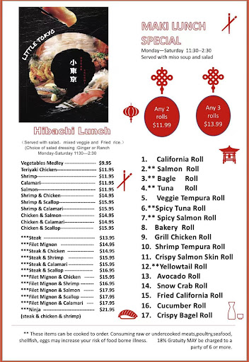 Delicious food. Sushi. Hibachi grill or table dining. Great service, friendly staff.