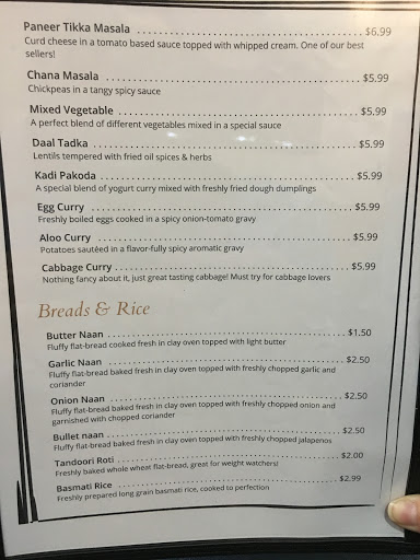 I wish I could give zero. First of all I called restaurant to ask if the naans have eggs in it as I am egg allergic, the lady who answered the call said no. When I placed the order thru doordash, I received the call that the naans has eggs and if I want to replace it with some other item. Anyway I replaced the naan with the tandoori rotis and believe me I just had one bite and I had to threw all 4 tandoori rotis in trash. It was like rubber sheet and overcooked.The curries were also tasteless. The kadi pakora was tasting like some tasteless pakora in yellow water. Paneer butter masala tasted staled. The worst ever food I had. Complete waste of money and mood.