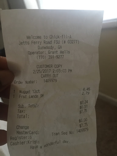 Never got my order messed up, and always consistent quality. Dining area is kinda bit small and usually gets crowed during lunch time, but if you can find a seat, this place is one of the best Chick-Fil-A Ive ever been.