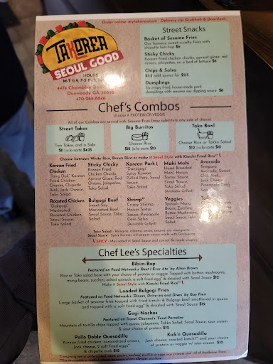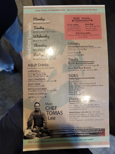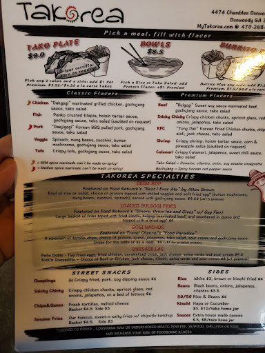 Takorea is an unassuming place in this strip mall in Dunwoody. Weve all been to one of these, looks trendy on the inside, cool decor, but ends up tasting like factory fabricated garbage... But I was pleasantly surprised. Service is casual, unpretentious, and quick. Its truly a great model of what quick service should be, and I enjoyed my experience. Should have those extra condiments on the tables, but I guess Im just a condiment person. Food is delicious. Its definitely honest, good ingredients that you can taste. I would even venture to say it is pretty authentic Korean, served in a Mexican platform. Their fries are inventive and delicious, they are never shy with flavor and spices. They could use some more stuff in their burritos other than kimchi fried rice, meat & kimchi, but overall its pretty decent. Great place for lunch!