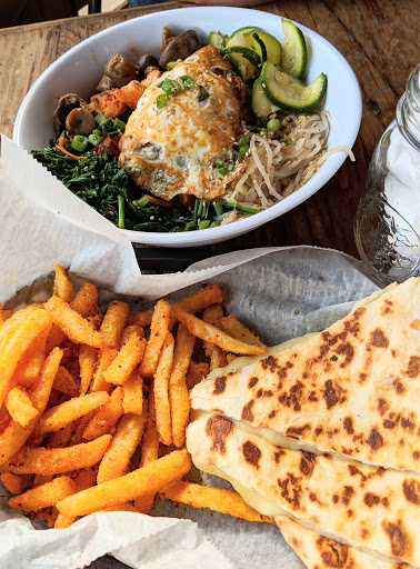 Takorea has a great variety of flavors in their food, Im always tempted to overeat when I go here. My ideal meal would be the one that the robot mural shows, namely one of every thing on the menu. Usually I limit myself to either the taco combo meal or the bi bim bap. Their spicy pork is my favorite meat on the menu, but all of them are very good. If you get the pork taco and a veggie taco, that is almost the same stuff that you get in the bi bim bap bowl, minus the rice and the egg. Then you can also get the sesame fries, which are excellent.