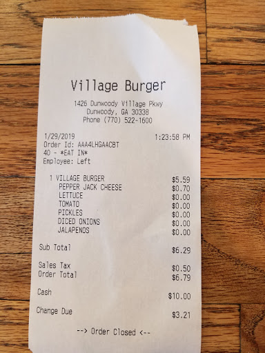 I really want to support independent Dunwoody restaurants like Village Burger but Im all out of free passes after last night. You get my order wrong 80% of the time. Who forgets cheese on a cheese burger?! And I send it back only to get a cold slice of cheese on my daughters now shredded burger. Plus I dont need attitude from your teenage wait staff and that utterly disgusting restroom I took my kids into is a deal breaker for parents. With Farm Burger close by why would I subject myself to this? You need to take a good hard look at your customer experience.