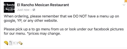 Had the carnitas tacos and the camarones en chipotle and both were very good. The tacos are big! Loaded with deliciously prepared meat. You definitely get your moneys worth. There is no menu published for this restaurant, I took pictures of it to share with this review. Their prices are subject to change but at least youll get an idea of what the prices are like and what they offer.