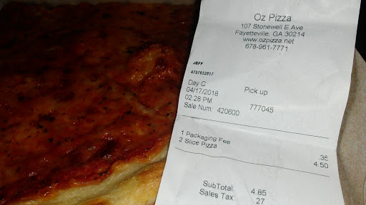 Ive been going to another OZ location for well over 13 yrs now however I work in the Fayetteville area and went here due to convenience. I wont be coming back. My first experience was me getting majorly shorted the cheese for two Hercules slices. Second experience I ordered extra cheese in my calzone(undercooked by the way) and didnt get it, even though I was charged for it. As I stated I been Ordering the same thing every time at one of the other locations for years and I felt it was purposely done both times.