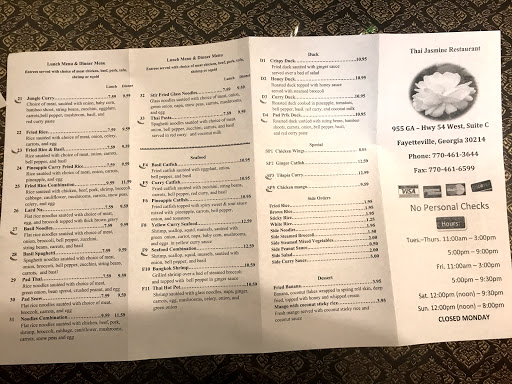 Wonderful! If youre looking to try something new or really want some great Thai food, I highly recommend Thai Jasmine. We had an enjoyable lunch at Thai Jasmine. My husband ordered the Crispy Duck. It was awesome. I had the Panang (Phanaeng) Curry. It was amazing as well. We tried the Dumplings for an appetizer and loved them!