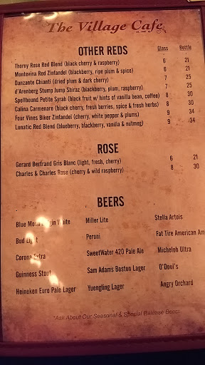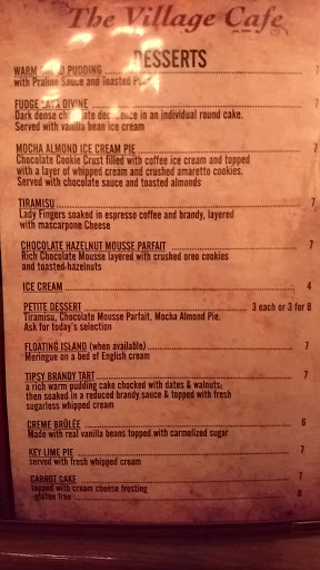 wow ... such an upset. I worked in restaurants for years ranging from Italian to 4 star cuisine. we held a small birthday party (may 11th around 6:30pm). The server was bland, and I often found myself looking over my shoulder for his attention. With a party of 12, we at least expected our drinks to be maintained.When our food arrived, our server was no where to be found until after we had well broken into our meal. With the introduction of a birthday cake, the server rudely made it known to everyone at the table (instead of just the host) that a $1.50 per person "plate fee" would be added to the bill because the Village Cafe did not bake the cake and we were told that the Village Cafe makes their own deserts which we all should have chosen. When we inquired if a birthday cake fell into the category of desert, we were instructed that it was company policy. (again this was announced to the entire table). after a clean knife finally arrive, the server once again disappeared. I constantly found myself hunting down our server. Appetizers tasted as if they were thawed and microwaved. At our party also were two small children, the food on the childrens menu (we chose fettuccine and chicken strips) tasted microwaved from a frozen entree. With the pricing of the food on the menu, we expected much more. Being a former server, we do understand they tipping process and were nearly "ashamed" at the automatic charge of 18% gratuity, which the server did not point out until after we had signed our debit and credit slips. Even with horrible service, we typically tip more than the 18% that was included in our bill. If this server had worked instead of paying attention to his smaller tables, he would have exceeded his 18% expected tip. Once we signed our slips, we never saw the server again. I dont believe anyone at our 12-top will be visiting Village Cafe again, apparently the horrible experience remained in our conversation for a few days.