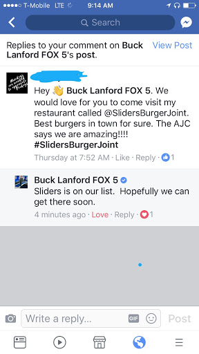 Try Sliders Burger Joint for the first time tonight. My whole family was pleased with their choice of sliders. One of my nephew even said this should be the new Friday night dinner. The only down fall I seen was not much parking & paying for refills. But the great food & great customer service out weighs both of those issues. So stop reading these reviews & check it out for yourself.