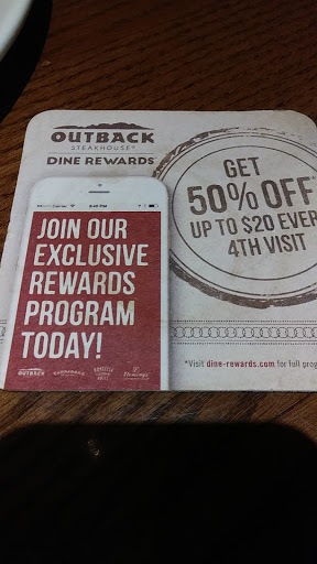 Sehr gutes Restaurant der Steakhauskette, zwar nicht ganz billig, aber das Preis-Leistungsverhältnis ist sehr gut. Die Bedienung hat uns am Empfang freundlich begrüßt, der Service war hervorragend und schnell. Die Steaks waren genau wie gewünscht (medium) und die Beilagen hervorragend. Das ganze Ambiente des Lokals ist sehr ansprechend und gemütlich. Ich war schon Dutzende Male bei Outback in den ganzen USA und wurde noch nie enttäuscht. Ich komme sicherlich wieder. Kostenlose Parkplätze gibt es direkt vor dem Lokal.