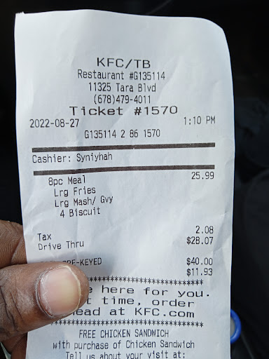 The KFC/Taco Bell on Tara Blvd is perhaps the WORST “fast” food establishment I’ve ever visited and foolishly had the nerve to revisit. The staff is incompetent, too young and playful, and the establishment never has the items they advertise that they sell. At my first visit, they had no grilled chicken prepared and weren’t willing to offer to prepare any. “We ain’t got no grilled chicken, sir. Can I offer you original recipe?” I responded, “No. Put some grilled chicken on; I’ll wait.” During my 30-minute wait, I had the displeasure of hearing the KFC associates tell other customers in the most uneducated-sounding, broken English, “We ain’t got no mo thighs,” and “ We ain’t got no mo nacho cheese,” and “We ain’t got no mo mild sauce,” and finally, “We ain’t got no mo Dr. Pepper.” Eventually, I got my grilled chicken. I foolishly visited the establishment a second time after receiving coupons in the mail announcing their recent remodel and including special offers. I brought two coupons to the store only to hear that I could only use “one coupon per transaction.” “Ok.” I said. “Let’s do separate transactions.” The KFC associate says, “No. I meant one transaction per visit.” I kindly asked to speak to the manager. The simpleton manager goes on to say the exact same thing the previous associate said, “Only one coupon per transaction.” Again, I offered to do separate transactions. The manager said, “No. I meant one transaction per visit.” “Would you suggest that I leave the store and go through the drive through in order to use my other coupon?” I asked. “Do you take snapshots of each customer who uses a coupon?” The simpleton said, “I don’t understand what you mean.” I went on to explain, “Suppose I had come in earlier today with a coupon. I’m now back, some four hours later, to use another coupon. Would you tell me that I can’t use my coupon because I came in four hours earlier and used a coupon?” He said, “Sir, I’ll make this exception for you today.” Should I really have to go through this nonsense with a manager? I wouldn’t recommend this establishment to anyone. Honestly, I’ve come to the realization that this type of abysmal customer service is common place in metropolitan Atlanta, and as soon as I can leave, I should.