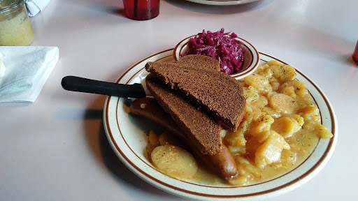 My family ate here today, it was overall disappointing. Two people had burgers which were not bad, slaw, kettle chips and a pickle. The taste was pretty good. +1 star. Considering it is a tourist establishment, the $10 price tag for each was not bad. I got a Wurst platter and opted for the extra wurst: a bauernwurst and a knockwurst with sauerkraut, German potato salad and pumpernickel bread. The salad was good so +1 star, but the knockwurst was actually cold. Not lukewarm, cold. After asking for it to be heated, it came back STILL cold. -1 star. As for the non-food aspects, the wait was incredible. It took them 15-20 minutes to get our food (though part of it was still cold), then it took an unreasonable amount of time to get a check, and then for them to return with it. -1 star. So at the moment, we are at 0 stars. BUT, the view was great, and our server was very nice, new, but very nice and apologetic. So +2 stars. Overall, Id say if you want some food and fast, Id walk a little and just go to the Wendys down the street. And then go back to Grannys funnel cake place and eat there because that was amazing.