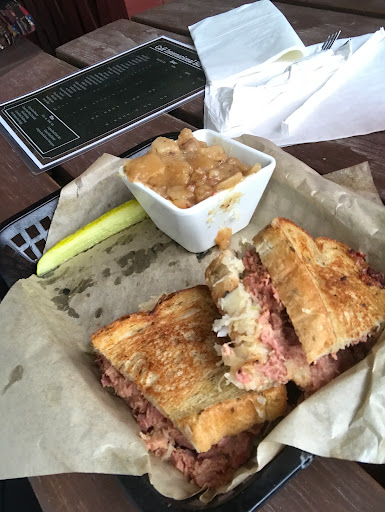 Small parking area. Went there primarily for the one German item not at the others, wienerschnitzel (veal, others only had pork), and of course they had just run out. Ignoring that, the cold beer & atmosphere was excellent, pleasantly relaxing looking out over the river. I ordered the Italian pastrami melt, which was very delicious and hit the spot, included good Cole slaw, pickle, & chips.