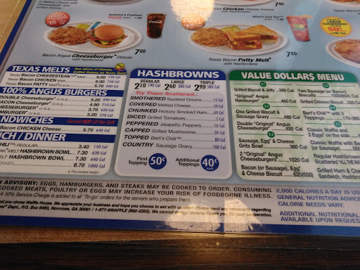 Worst food I ever got from a Waffle House. Hash browns was half raw, not browned at all & had way to much oil.. Couldnt even eat the crap.. Will never go to that Waffle House again. The server was nice & on top of everything. So I did tip her well, she wouldve got a better tip if they didnt serve raw food... Store location # 1106