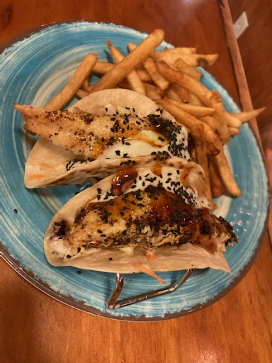 Great service, good food. I had the Drunk Chicken and was pleased. I am not a fan of sweet salad dressings but many are. Chicken was tender and well prepared. Hubby had the fish and chips and chip were fabulous. Fish was good but a white fish we are not familiar with. Prepared well. I felt prices were reasonable for the quality. The musician playing was really good! Enjoyed the ambiance and the experience.