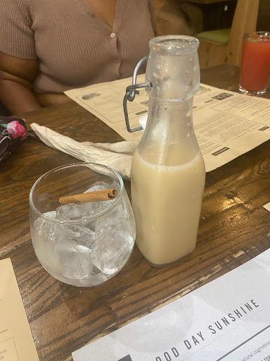 We were so pleasantly surprised at the vegan options. We had the green juice with a veggie burger and coconut chia pudding for dessert.