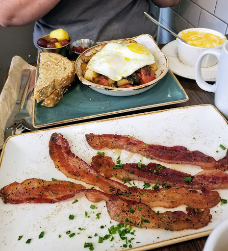 I sat at the communal high-top farm style table and drank water from a milk jug and ate breakfast from a small cast iron skillet. meta-hipster. Also the food was amazing!! Service was great. Will return when back in the area. Price was a little high, like over $2 for a cup of coffee and most breakfasts were $10 plus. But portion was large and I took about half home. If the special Chilaquiles is on the menu, get it, you will not be disappointed.