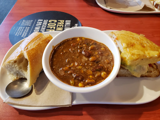 During our visit they were very busy, and OUT of everything. I ordered a bagel toasted, which I received not toasted and a slice of their cinnamon coffee cake which they forgot to serve. My spouse ordered the flatbread, and since they were out of flatbreads, they gave it to him on Texas toast which was skimped as ever. Might try this location again one day, but not anytime soon.