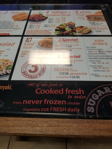 The service was great, very friendly and welcoming. Its a nice place to chill and relax. It was a little heated from the stoves and ovens but bearable, very clean and organized. The food was unbelievably good. Just try it and youll see what Im talking about. The prices are priceless, very affordable and budget friendly. I will go back again with family and friends. Great job J Buffalo Wings