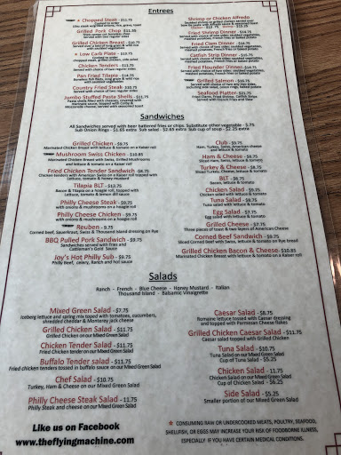 We have 5 kids, age 7 to 13. We come to the Flying Machine on average 3 to 4 times a month. We like the value, food quality is really good, and the family atmosphere is enjoyable! We really like to support our local economy and our local businesses… Forego the chain restaurant and enjoy a really good meal at the Flying Machine!