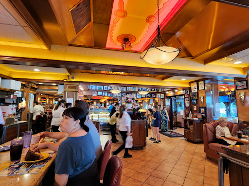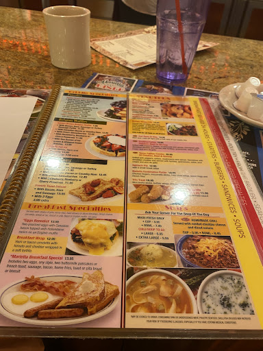 New in town and this place was recommended. The cakes are impressive behind the counter when you walk in and the menu is equally huge. Food - The salad had lettuce that was turning in it. The gyro meat was that kind that clearly comes in frozen in individual slices and is just heated on the flat top before serving and tasted like it too. The Seafood trio special was impressively large, but the the salmon was dry and flavorless, I honestly get way better salmon at the cafeteria where I work for 1/3 the price. The dish also had 2 stuffed shrimp and a stuffed flounder (or sole, cant remember). On the paper menu we read while we waited, the description was crab stuffed, then at the table, the real menu stated seafood stuffing. That should have been a clue for me. The large amount of stuffing appeared to have so much crab, I was so happy, until I tasted it. It was mushy...wait, this is that fake crab! I was embarassed for them that they would serve this garbage and charge over $20. Unbelievable. Service - When seated, after perusing the huge menu, we realized we had different menus. Even though it was about 7:00pm, we had been given the lunch menu. Not a big deal, but another straw for the camels back. The waiter never asked how everything was, not once. I told them no mushrooms, but received a large mushroom stuffed with the same offensive, inedible stuffing. A manager (owner maybe) came by right after the food was delivered before we had taken a single bite and said "everything is great, yes?" What can I say to that. Then when trying to pay, up at the front counter, like when out at a diner, after handing my credit card and bill to the cashier, the same manager, proceeds to push her aside and essentially take care of another customer on the same register in front of us. Wow. My advice - expect nothing more than cheap diner food and cheap diner service. Whatever you do, dont try to enjoy any of the more expensiv,e nice sounding meals on the menu. This is nothing more than a hyped up, cheap, get em in, get em out diner, which ended up costing me way more money than any diner should and provided worse food than any I can remember.