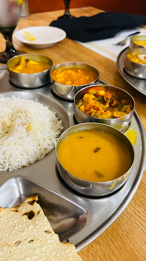 Great vegetarian Indian restaurant. For lunch they only do a thali plate, which currently consists of four different soups/stews, basmati rice, roti, papad, pakora, and a sweet yogurt dessert which I believe is shrikhand. You can get second helpings of most of the things served with the thali if you want. For $11 it is a pretty great deal. For dinner they offer the thali plate as well as sandwiches and a few different common Indian street foods. If youre going for dinner I highly recommend trying the bhel puri, it was absolutely delicious! The samosas were also great, crispy and fresh made. The only reason I give 4 stars instead of 5 is both times I have been here, the pakora served with the thali was not fresh. It was greasy and sort of soggy. Everything else however was excellent.