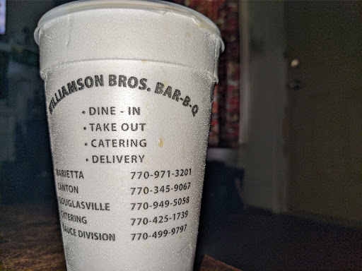Classic southern style pulled pork BBQ at its best. This is the original Williamson Bros BBQ location. They have at least two others around town that Im aware of, and here in the south theyve grown popular enough that you can even buy their sauces in Kroger. But youll see the secret to their success when you walk in the door, youll find a fire and youll see smokers. True slow roasted pork over smoke. They have other things including chicken and ribs, but you need to at least try the pulled pork to see what its really like. Now sauce is a regional religious issue. Traditional Georgia style sauce is vinegar based, you get a mustard base in the Carolinas, etc. Never fear, Williamson Bros has all flavors available each from their own recipe, so you can sloth on whatever suits your taste buds. I like a traditional sweet and spicy style personally. My tip for you as a regular... Its not on the menu but for a couple of bucks more you can make any of the BBQ platters "all you can eat" and re-order not only meat but any of their yummy side items as well. Dont forget to try the Brunswick stew, fantastic!