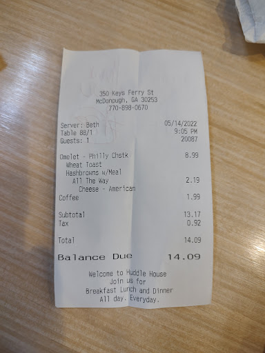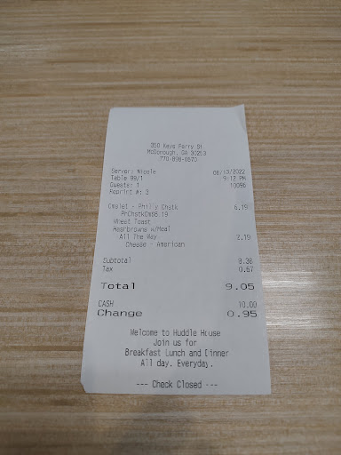 Huddle House is so underrated. Its a mixture of Waffle House and IHOP all under one roof. The waffles are crisp, the bacon is crisp. But my favorite is the french toast! Oh, its so amazing. The scramble eggs with cheese are delicious and creamy. I personally love their Ask for Carole, shes great as well.