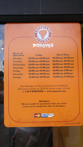 Popeyes does not accept American Express cards. That is not a very welcome response from the cashier after swiping the card and youre hungry and American Express is all you have. This establishment receives one star for the inconveniences created from their unwillingness to accept the American Express card.