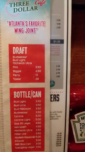 Birthday dinner at Three Dollar Cafe. Love their chicken wings, and TDC Chips. Great service and a very comfortable atmosphere. Watch your table selection around sunset as the windows are westward facing and the glare can be intense. Great place to watch a race or football game.