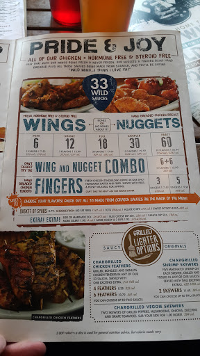 First time trying this place. Came to this one because it was close to the Courtyard hotel. Its a newer location as well! Reminds me of a Bdubs (Buffalo Wild Wings) type of restaurant sports bar. Wing menu attached below: I actually really liked the wings, I got the Fireball under the Sweet n spicy side, they were a very good hot and spicy taste. My favorite was the Wild West, its more of a dry rub with a ranch flavor. Tastes great! Its even good plain with no dipping sauce. And to continue the 18 count wings, I picked the Gold Rush under BBQs. You cant not have a BBQ in a wing selection. It was awesome! These two are my favorite that I tried here, Id definitely get wings from here again. The only thing I didnt like is I called ahead and they said 15 mins and I showed up 25 mins after and they didnt have the order ready. Also, their To go boxes are terrible, they dont stay closed so the wings got cold very fast. Other than that Im glad I tried them!