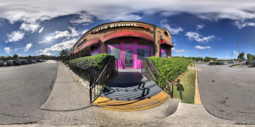 This was my first visit to any of the Flying Biscuit locations. My son from Austin, Texas was in town and enjoys eclectic and local fare rather than the big chain restaurants. He had the Fried Green Tomato Salad and really enjoyed it, telling me that I had made a good choice of restaurants (a high compliment from him). Others in our party had the Fried Green Tomato Sandwich and the BBQ Chicken Wrap...and enjoyed them (although my teenage son would have preferred the wrap without the collard greens). I HAD to sample one of your breakfast items. I tried the signature biscuits topped with scrambled eggs and turkey sausage gravy...with dusted potatoes. Good...but the biscuits were not as fluffy and overwhelmingly scrumptious as I hoped would be. The personable server tried to talk us into having grits, but we non-Atlantans are just not grits-eaters. The location was pretty empty on a rainy Thursday night .... And the atmosphere was lacking a bit......BUT if we lived closer, we would definitely return to the Flying Biscuit.....and who knows.....I might even sample the grits!
