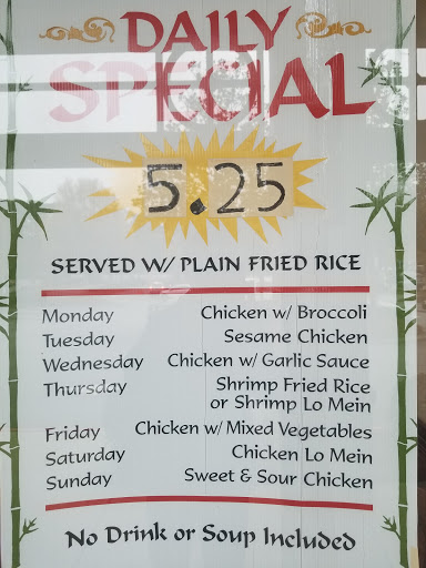 A great local family run Chinese restaurant. Large portions in a takeout atmosphere. You get great food at a great price with large portions. I am a big eater and I rarely can finish a combination meal. Plus, if money is tight, they have a great $3.99 daily special lunch.