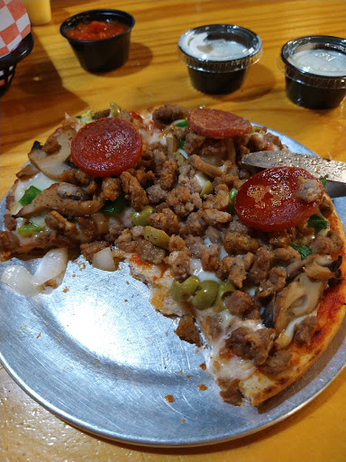 This places name would leave you to believe its specialty is pizza. However this places specialty is lousy food. The pizzas are made from the nastiest frozen pizza kits Ive ever eaten. I have seriously had many better pizzas from a super market. I can only imagine this place was busy because its in the middle of nowhere and the local gentry knows no better. I couldnt imagine anything being worth eating there when the pizza was so horrible.
