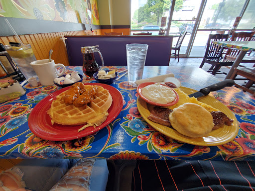 Review for Roswell location, breakfast. Quirky place that has grown to somewhat of a local chain. Unusual takes on classic breakfast foods (e.g. orange vanilla french toast; sour-cream in the grits) have a slight organic bent, but remain satisfyingly filling. Bright, clean, and comfortable atmosphere, with friendly, quick and attentive service. My wife and I loved it, but our 3 kids would have preferred a more typical breakfast place.