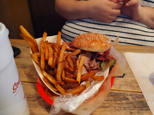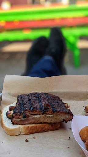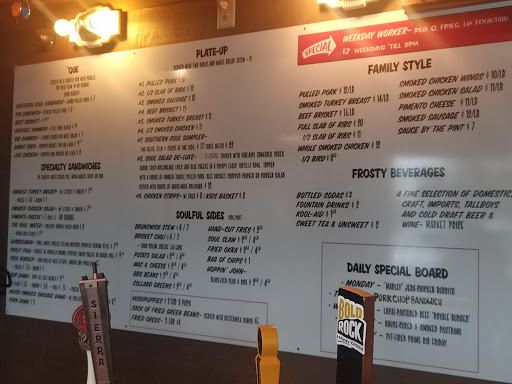 To start off, this place was packed when we visited in March. The food was decent. The brisket and ribs came out warm instead of hot. The brisket had a nice smokey flavor but the texture was tough and it was relatively cold. The ribs were great, very tender and fell off the bone but also barely warm. I imagined both meats would have tasted better hot. We were anxious to try the macn cheese but it was "86d" right before we ordered so we settled on fried okra, fries, hush puppies and meat stew. Not blown away by the sides. I doubt we would eat here again, but it was worth a try!