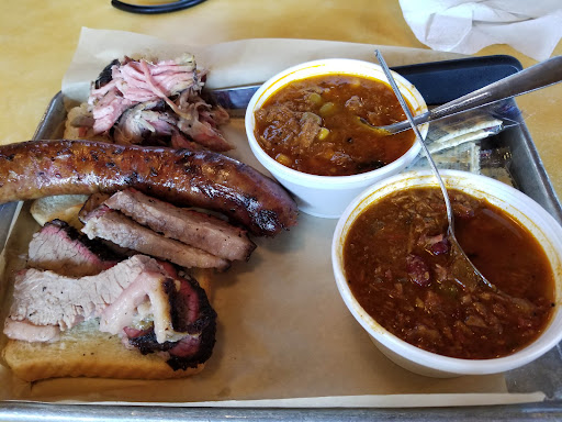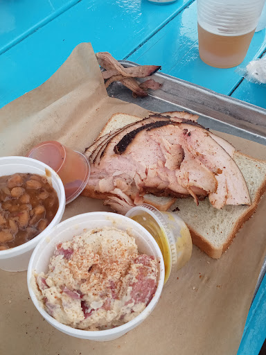 The food and customer service were great! My mom, our friends, and I decided to go in mid June and we split two meats. We decided on andouille sausage and brisket. As a side we got collard greens, Brunswick stew, and white toast. The andouille sausage was honest to God one of the best I have ever had, the Brunswick stew tasted of BBQ sauce and meat, and the brisket just fell apart. Our friends decided to get burnt ends, turkey, and brisket. The burnt ends and turkey would just melt in your mouth they were so tender. The only problem was the large number of flies around, but what can you do? Theyre attracted to the scent of BBQ as far as Ive seen.