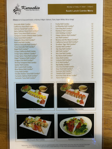 Kuroshio is a revamp of the former restaurant Blusushi. It shares tight quarters with a number of businesses in this mini mall complex and so parking can be difficult to find in the immediate vicinity. While the dinning room is small it is nicely done, however the flat screens and ball games can make it seem like a sports bar at times and the ghetto "trap" rap music blaring club level loud will spoil the freshest sushi and definitely must go. However, Kuroshios offerings are bountiful, the menu is magazine thick and list everything from salad, soup, tempura, yakitori, nigiri, poki, sashimi, ramen and udon, a variety of specialty rolls and lemongrass dinners which are their vegetarian offerings. The food is very good, prepared and presented well, aside from the annoying music other irritations are the spotty service, which is mostly good yet at times can be unacceptably obnoxious and rude. Additionally, the place is small so there could be an extended wait for a table or service once seated, and there are petty fees for take out orders and request for extra sauces. Beyond those few inconveniences Kuroshio is very good a sushi bar and certainly worth a visit, however sushi snobs and purest should stay away and save everyone their pretentious assessment.