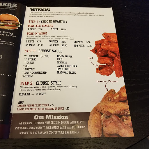The turkey burger was great the way the cheese was melted and the grilled onion...just great. The wings were not my favorite a little on the hard side and something about that sauce I didnt like. The ONLY con is suggest they cook your turkey burger on a clean griddle with a clean spactula BEEF FREE or you will end up sick. Not because of the food but because of the beef remains and I DONT eat beef!! The lady behind the counter was helpful just not with a smile so service could be better. There is a minute wait but for that burger (beef fat free) I would wait forever.