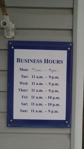 | Working: | Closed 11AM–9PM 11AM–9PM 11AM–9PM 11AM–10PM 11AM–10PM 11AM–9PM |