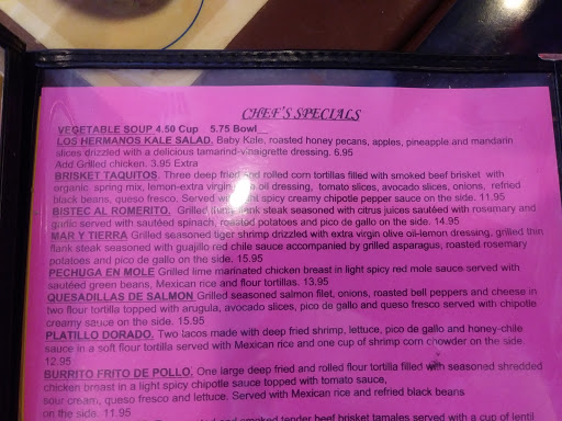 If Los Hermanos isnt your favorite Mexican restaurant, you havent eaten here yet. Friendly staff, experienced cooks, and diligent service make dining here a pleasant experience. Never an empty drink is had when dining-in, and if thats not your style, call ahead and have your to-go order ready when you walk in. Spoon-shakers beware, the meat is piled high in generous portions as it should be. Seriously, Los Hermanos is a testament to the future of Mexican dining and has maintained this standard for years. Try the Burrito de Lujo with the Queso/fresh jalapenos app, you wont regret it.