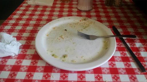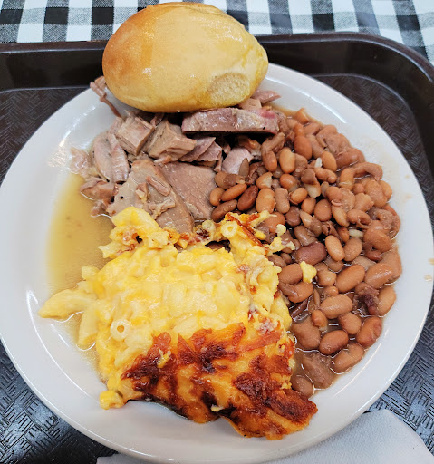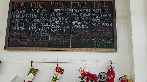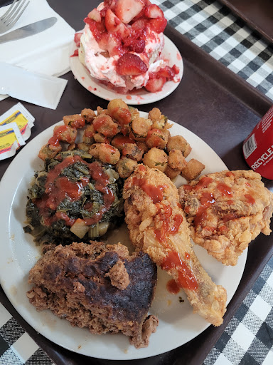 I got there at 11:10 am. They open at 11. When I left 30 minutes later the line was pretty long. I had a breaded or battered fried pork chop, turnip greens, mashed potatoes, gravy, tea, and strawberry short cake. All that was about $13. I think the mashed potatoes were from dehydrated flakes;they tasted fine. The gravy was ok. The turnip greens were delicious. I liked the pork chop but the knife was so dull I couldnt cut it. It had a bone so I picked it up and ate it with my fingers. The strawberry short cake was the best part of the meal. It had two layers of cake with whipped cream and fresh strawberries in the middle and then more fresh strawberries on top. Theres no service or ambience but who cares? Not me. I was there to eat!!!!