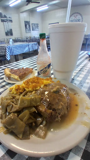 Matthews is about as good as a meat and three gets, and I write that as a fan of such cuisine. In my view, Matthews has been success for 70something years simply because they season food well in its preparation. Over the years, Ive adjusted to 21st century pricing that rarely gets me out for less than $10/head. My only suggestion is that maybe now that it looks like yall may make it, you might want to go ahead and drop a few $s into replacing some of the WWI surplus metal chairs. Breakfast is a treat as well. Nothing fancy, but a pretty good 5am nosh. FYI---written several of these now of establishments haunted for nearly 2 decades. No 5 stars yet. The logic being that once 5 stars is give, then what? so Matthews = 4+ STARS