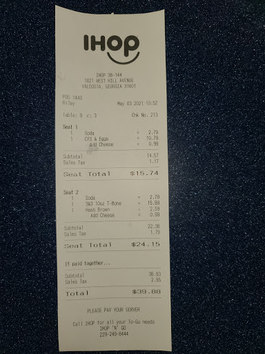 We waited a long time for our food with barely anyone there and when it came there was hair in my husbands eggs. The supposedly remade his plate this time the eggs was disgusting...two of us tested them. Both mine and my daughters grits and hashbrowns tasted weird. The tea was sour. Our waitress disappeared to make tea. Never refilled our cups. Amongst other issues i have to say this is the worst ihop ever. We love ihop and visit many different locations but will NEVER go back to Valdosta IHOP.