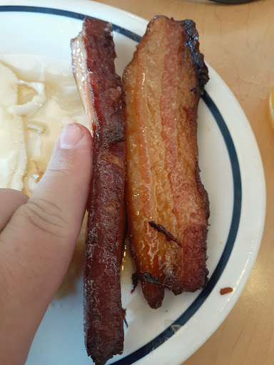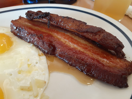 Expensive bad decision to go to IHOP - VLD. Should have known better - high noon, two customers in a very large dining area, staffing was not a problem - 5 wait staff with almost nothing to do. Scrambled eggs were dry, crumbly, very small serving, ham was overcooded such that I was not able to cut it with the table knife, hash browns charred black) bacon was limp and greasy, toast not buttered, PROS: water was good, coffee was tolerable, pancakes were good. So $18 for glass of water, coffee, and 2 pancakes. Server was friendly and was probably embarrassed to serve such fare -- cook - definitely not chef - was main problem. Will NEVER be back -- will try adjacent Waffle House next time. Lady at adjacent table told server ¨I can t eat this . My dog did eat the ham and bacon, so not a total loss. I hope others have better luck.