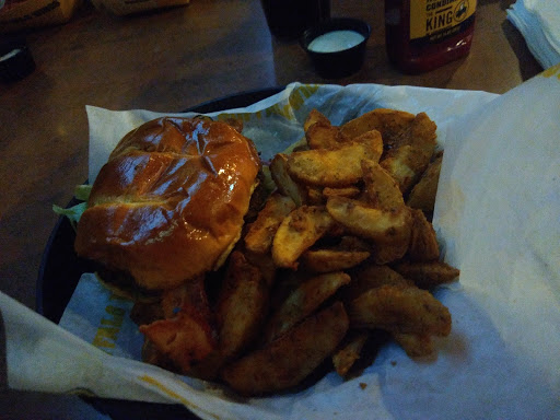 Service was good, friendly and efficient staff. Wide selection of beers, bar manager was going around tables in the bar area offering beer samples. I got a hamburger, wouldnt recommend it, not the best quality/testing beef. Next time Im in a wing joint, Ill stick to getting wings.