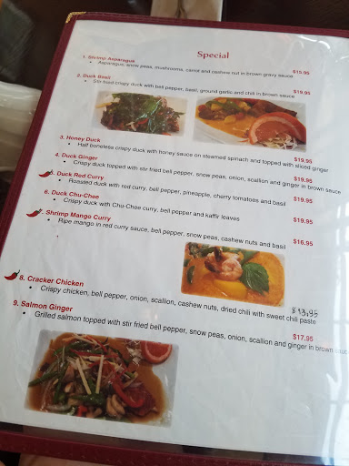 Placed an order by mistake and One of the Worst food ever. Duck and basil Fried rice, couldnt find the basil and duck, beside a few skins and white rice. Besides it, half the amount of my local Thai restaurant and charged more than $18. Got crab Rangoon for free and just by looking at it couldnt eat it. Staff was very nice. Wasted my time and gasoline. I am not a cook but could do better than it with a recipe. I could never serve something like I got at this restaurant, a rip off.