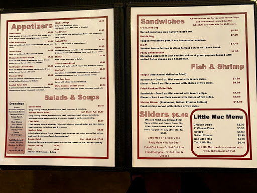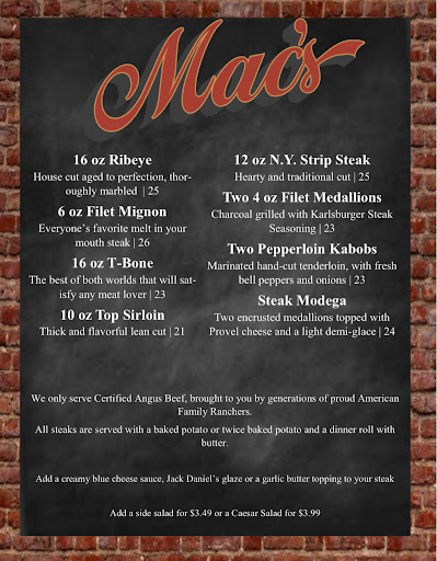 The doorman at Macs illegally discriminated against me for having a Service dog, which federal law allows me to take anywhere. After explaining the law to him, the doorman grabbed by hands free leash, which goes around my neck and shoulder, and he choked me with it and forced me out the door. For no other reason than me having a Service Dog at my side. That is assault. I am letting you know, because if he will do that to me, he will do that to a veteran or anybody else who is disabled. After going back the next day to talk to Mac, he would not allow me in his business and screamed at me, blaming me for pushing his employee (who was choking me) off of me. He would not give me the time of day to talk about what happened that day and resolve it civilly. What is stopping him from refusing someone who is in a wheelchair next time? Think twice before patronizing his business again, please. Mac refused to do anything about it. Macs does not want disabled people as customers. By the way, the food SUCKS!