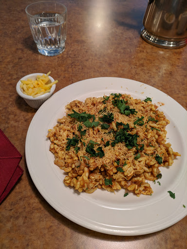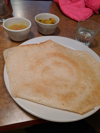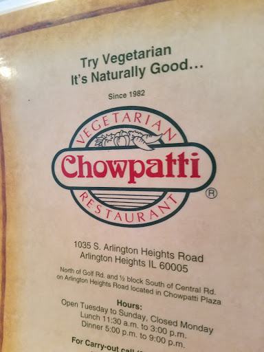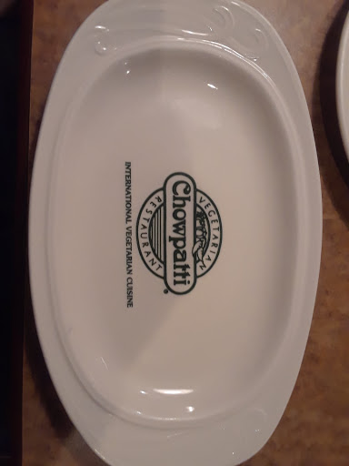 While visiting family in IL, we visited Chowpatti. Because Im a vegetarian, it seemed like a great choice. The restaurant is in a very busy strip mall with a hectic parking lot. The strip mall doesnt do this charming restaurant justice. Our server was pleasant and attentive. The menu was HUGE. At one point, we noticed that we were reading page 17. This is mostly an Indian restaurant, but there is a large variety of selections such as hamburgers, spaghetti and meatballs, salad, Mexican food, and pizza. My friends had never tried Indian food before and Ive had it a lot. I was glad to go to a vegetarian Indian restaurant so I could get anything on the menu. We got the mixed plate to share, which was one samosa and one aloo wada with a tamarind chutney. Both were very good. The aloo wada had a little spicy kick to it. For dinner, I got the Spicy Pav Bhaji Dosa and added paneer. It comes with a sambhar sauce. I ordered mine medium and it was very spicy. Id say it was more medium-hot. The dosa was huge and I couldnt possibly finish it. One of my friends got the Aloo Wada plate and the Masala Paratha flatbread. Both were very good. We really liked this particular flatbread... and it helped cut the spiciness of the aloo wada. My other friend got the Steamed Vegetable Biryani, which was mild and savory and the Paratha flatbread. I, personally, was glad to be able to eat some of their flatbread to give my tastebuds a break! A few things to note: Most of the Indian dishes do not come with flatbread or rice, these things are a la carte... and highly recommended! There are no free refills on the sodas, etc. and the drink glasses were small. Although, a water pitcher was left at our table and was apprecaited. There were tons of juices and smoothies to choose from, but we didnt go there. The Indian dishes were a little pricey and when adding flatbread rice, it adds up.